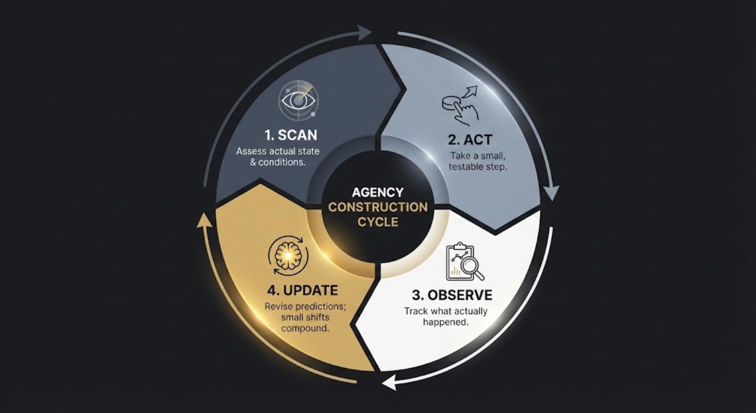 Agency is not a trait you have; it is a loop you run. The brain learns naturally by making predictions, testing them, and updating based on errors. The SAOU Loop makes this automatic process conscious and systematic. It replaces vague "trying harder" with specific experimentation.